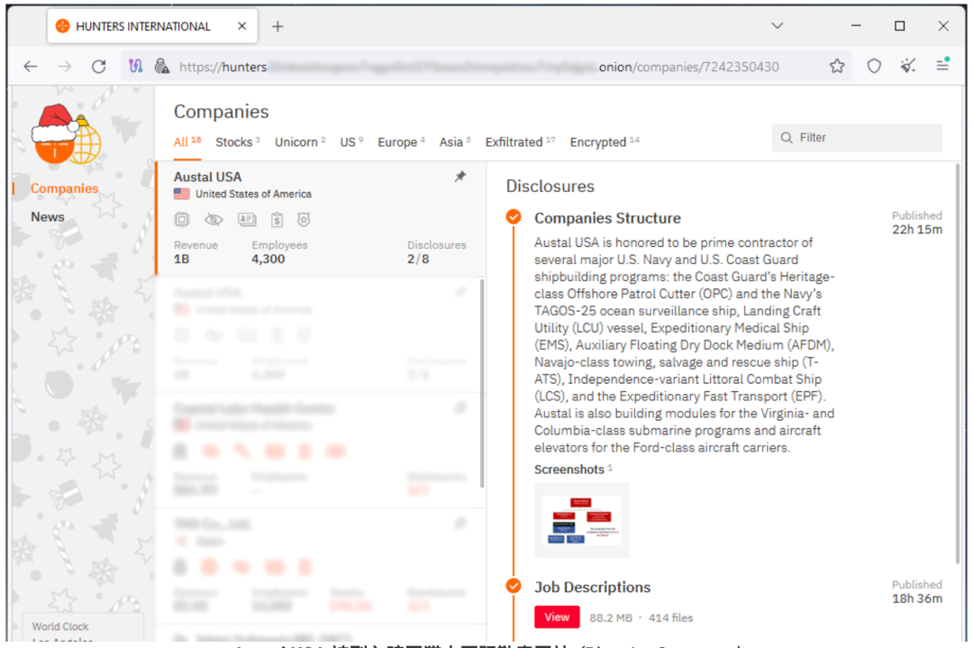 本周三晚间,索软猎人国际(Hunters International)勒索软件和数据勒索组织声称入侵了AustalUSA,美国目承并泄露了一些信息作为入侵的海军证据。