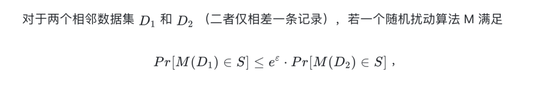 为解决这些问题,差分隐私(Differential Privacy,简称 DP) [1]技术应运而生。该技术提供了一种严格、可证明的隐私保护手段,且其保护强度不依赖于攻击者所掌握的背景知识。由于这些特点,差分隐私一经提出便得到了学术界和工业界的广泛认可和应用。特别地,差分隐私的通用定义为: