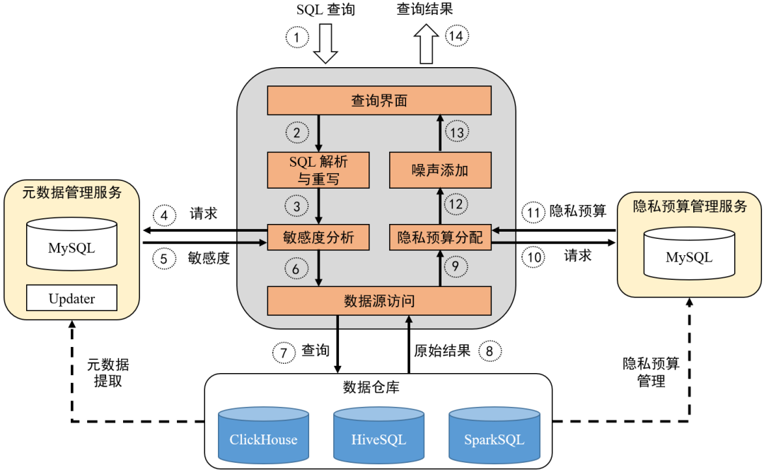 最后,核心服务调用隐私预算管理服务得到为该查询分配的隐私预算,并结合敏感度在原始的查询结果中添加噪声并返回。