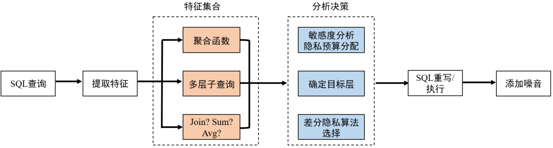 首先,核心服务接受客户提交的 SQL 查询语句,对该语句进行解析和重写,以便于计算隐私噪声(如将 AVG 计算改为 SUM/COUNT);