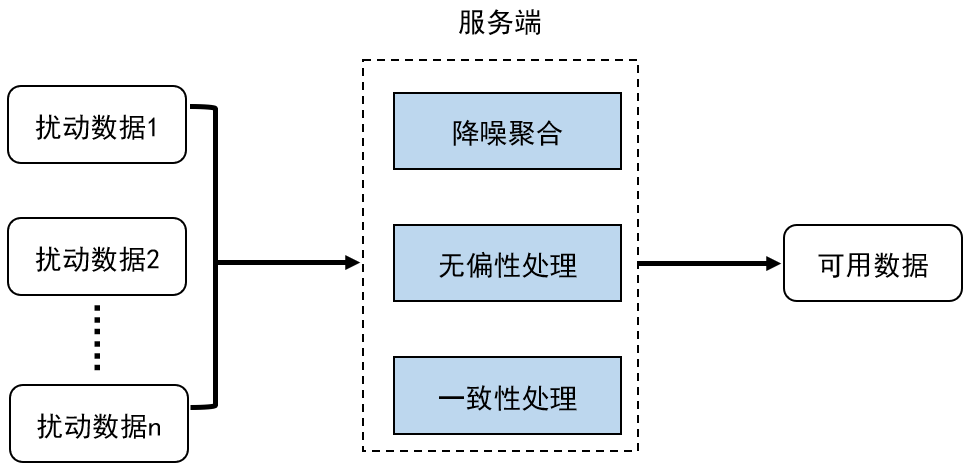 服务端:收集汇总客户端传输的数据,提供定制化的降噪聚合机制,用于对汇总的数据进行降噪聚合处理,提高数据可用性。处理后的数据可应用于推荐系统、统计查询、机器学习等数据分析服务;