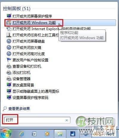 小勇点了一下Windows 7桌面左下角的速找圆形开始按钮,在搜索框中输入“打开”,系统小游戏选择“打开或关闭Windows功能”。自带