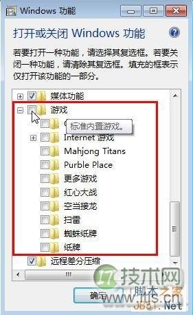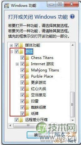 Windows 7设置中,整个游戏分类都没有勾选,自然看不到Windows 7小游戏啦。勇勾选需要启用的Windows 7的游戏,然后点击“确定”按钮保存设置。