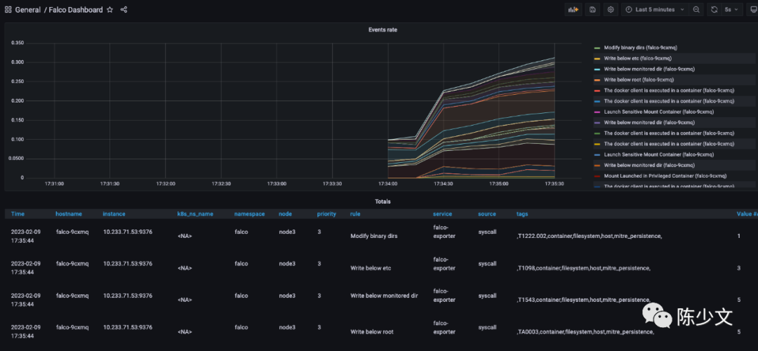 但 Metrics 中暴露的信息比较有限,在 Prometheus 中查询 falco_events{rule="Read sensitive file untrusted"},得到结果 falco_events{app_kubernetes_io_instance="falco-exporter", app_kubernetes_io_managed_by="Helm", app_kubernetes_io_name="falco-exporter", app_kubernetes_io_versinotallow="0.8.0", helm_sh_chart="falco-exporter-0.9.1", hostname="falco-h57xg", instance="1.1.1.1:9376", job="kubernetes-service-endpoints", k8s_ns_name="<NA>", k8s_pod_name="<NA>", namespace="falco", node="node1", priority="4", rule="Read sensitive file untrusted", service="falco-exporter", source="syscall", tags=",T1020,T1083,T1212,T1552,T1555,container,filesystem,host,mitre_credential_access,mitre_discovery,"} ,并不会展示执行的用户、执行的命令等详情信息,只能看到事件的优先级、触发的规则等有限的信息。