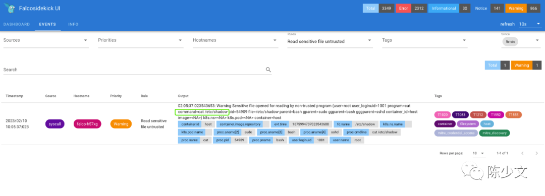 在主机上,读取敏感文件 cat /etc/shadow 之后,在 falcosidekick ui 页面就可以查看到相关的事件,如下图: