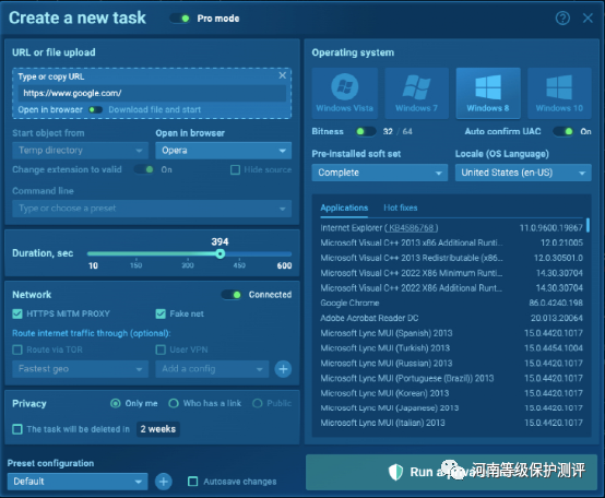 步骤 1. 设置虚拟机可以自定义具有特定要求的 VM,例如浏览器、Microsoft Office、选择操作系统位数和区域设置。添加用于分析的工具并将它们安装在 VM 中:FakeNet、MITM 代理、Tor、源码库VPN。也可以在沙箱中轻松完成,以ANY.RUN为例: