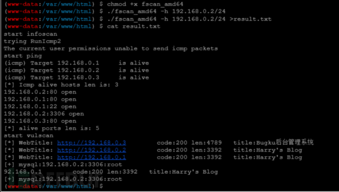 显示有一个网段192.168.0.2/24,传一个fscan扫一下(将结果输出到文件里边,不然没有回显)