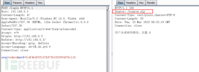 什么也没有,尝试弱口令,没用,爆破,没结果,想着抓包试试爆破,结果返回包里边提示source.zip