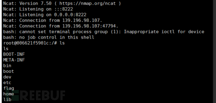 所以选择工具给好的对应springboot的URI,构造好payload,vps上nc监听反弹端口,将payload填入登录框中,点击提交即可接收到反弹回来的shell了