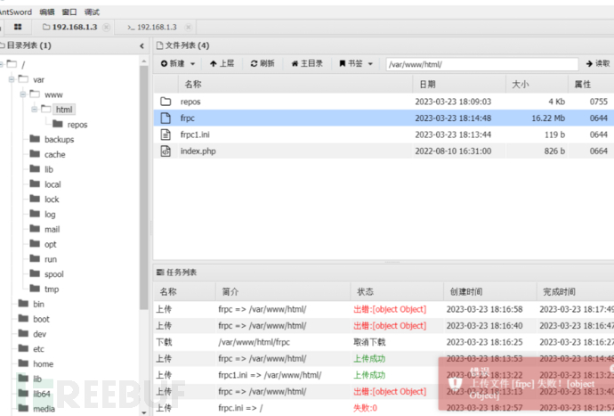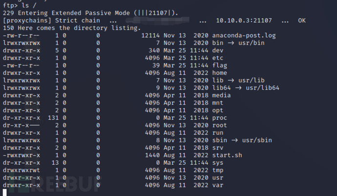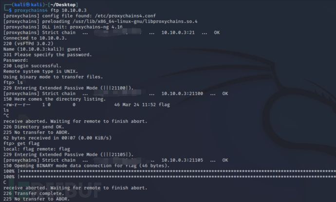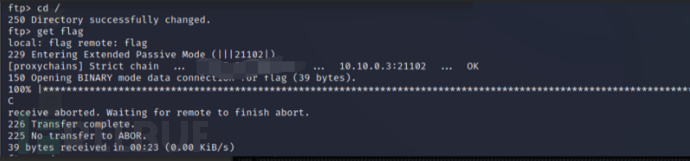 看一下结果发现10.10.0.3这台机子只开了21端口,该端口对应的是ftp服务,题目的提示该不会是ftp的账号密码吧,继续上frp挂代理,可是这次再上传frpc的时候一直出现问题,