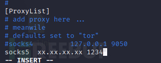 转到kali,先在/etc/proxychains4.conf里加上socks5代理,