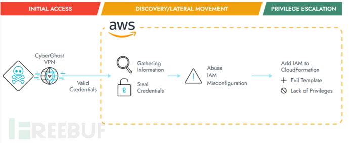 使用假设角色访问额外的特权,以便完全控制AWS Lambda。将受损的IAM用户添加到一个新组中,并获得CloudFormation服务的使用权限,该服务可以被滥用来创建资源或进行进一步的特权升级。使用新的访问权限进行更深入的信息收集活动。在此案例中,攻击者使用著名的虚拟专用网络(VPN)服务CyberGhost来隐藏源IP,并使用AssumeRole API来获得额外的权限,进一步通过杀伤链向主要目标发起攻击。