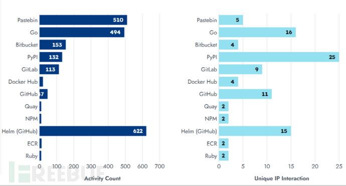 1.云攻击者瞄准工件存储库(Artifact Repositories)在研究过程中,Sysdig TRT将有效的云凭据分发到十多个注册中心、包存储库和公开的版本控制系统存储库中。研究人员监控的大多数活动来自公共包存储库和数据站点,如Pastebin、Python包索引(PyPI)、Go和helm,如下表所示。