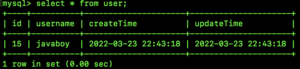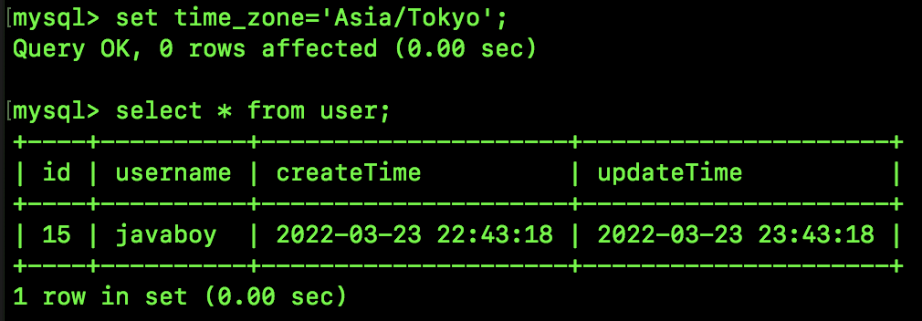 其中,createTime 字段是 DATETIME,而 updateTime 是 TIMESTAMP,现在我修改一下数据库时区,我们再来查看: