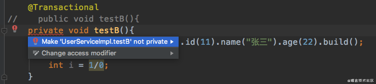 public void testInvokeBInOneClass(){ User user = User.builder().id(10).name("王二").age(22).build(); userDao.addUser(user); testB();}@Transactional