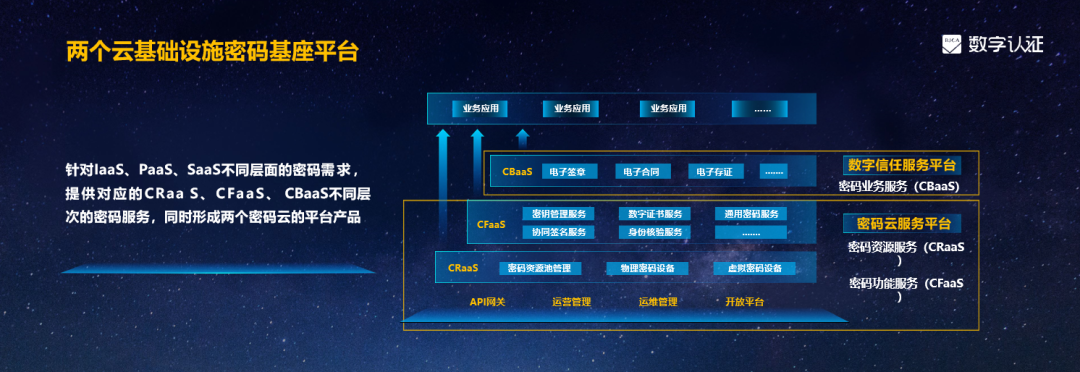 在云计算的架构下,数字认证将传统架构里各种密码功能产品全部整合起来,针对IaaS、PaaS、SaaS不同层面的密码需求,提供对应的CRaaS(密码资源服务)、CFaaS(密码功能服务)、 CBaaS(密码业务服务)不同层次的密码服务,同时演变成密码云的服务平台和数字信任的服务平台,形成基础设施双平台,与数字认证可信第三方云服务一起,打造全栈解决方案,覆盖密码上云的各种场景。