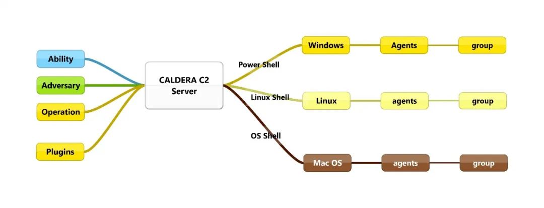 CALDERA服务器上包含Ability、adversary、operation和各种有用的插件,而通过将代理(Agent)部署到不同平台的机器上,可以对目标机器完成攻击模拟的实现和缓解措施的测试。