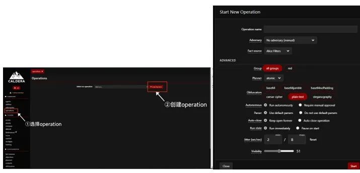 CALDERA OperationsOperations选项能自定义攻击剧本并对剧本进行执行。操作步骤见图6如下:① 选择operation标签;② 点击“Create Operation”创建operation;③ 选择相关选项,开始operation。