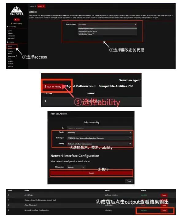 Access提供了CALDERA的Ability中所有功能的单项实现。通过使用Access可以从数据库中为任何具有任意Ability的代理分配任务。这对于执行初始访问攻击特别有用。要做到这一点,需要在目标机器部署一个代理,并使用pre-ATT&CK或初始化Access策略来分配任务,指向任何目标。用户还可以远程部署代理并将其用作代理来执行初始Access攻击。具体操作见图7所示。