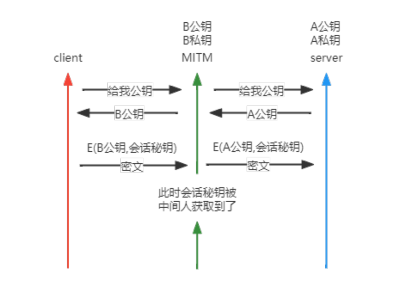 这⾥还并不安全,还涉及到中间⼈攻击。( 指攻击者与通讯的两端分别创建独⽴的联系,并交换其所收到的数据 )