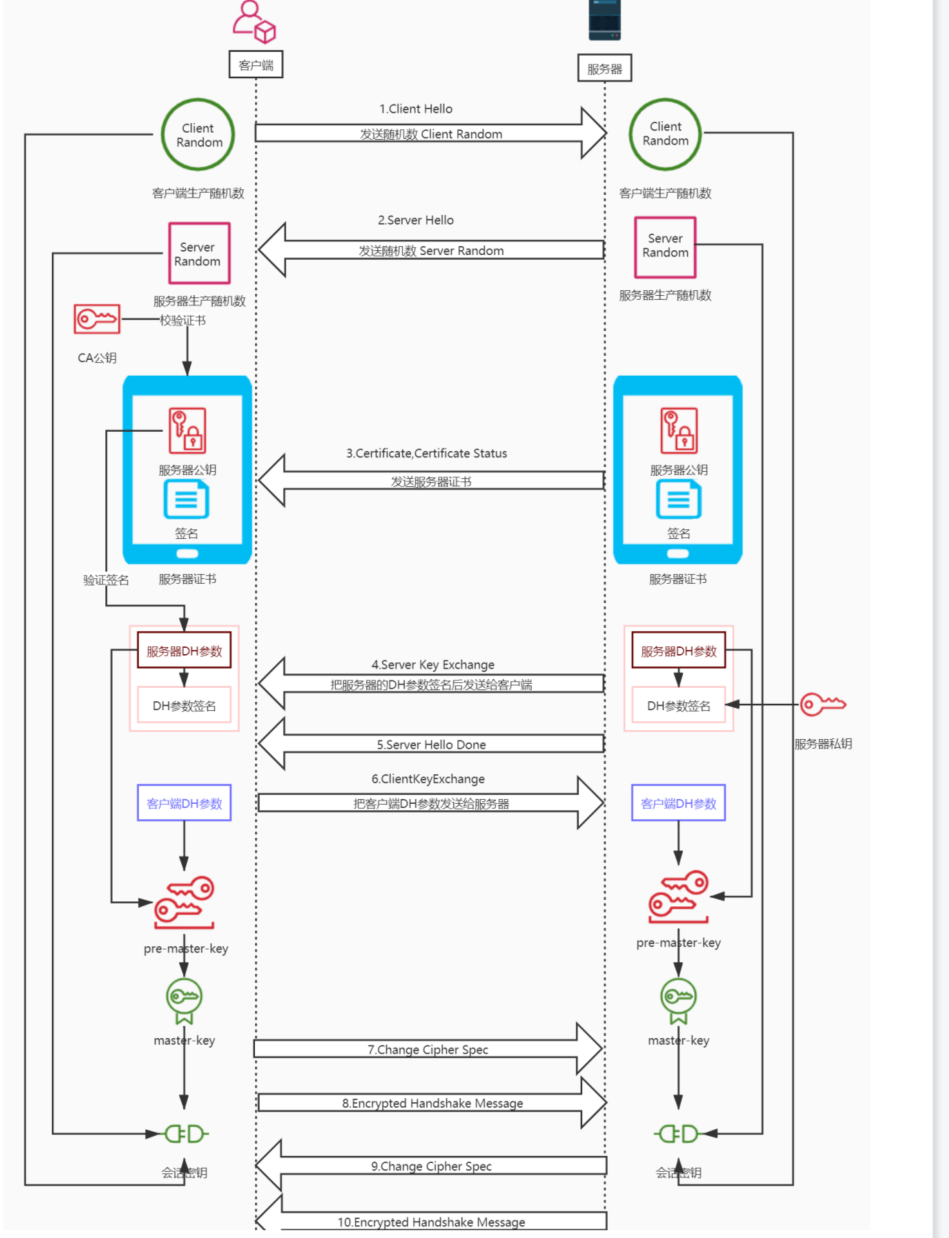 通信刚开始的时候使⽤⾮对称算法,交换秘钥。在客户端⽣成会话秘钥后传送给服务端,后续通信采⽤对称加密的⽅式