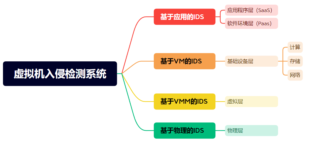 IDS可以基于检测入侵的方法、检测入侵的反应/响应方法、体系结构或虚拟机来分类,如图3所示。
