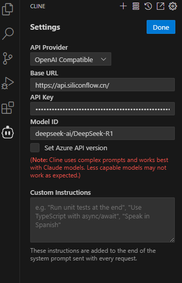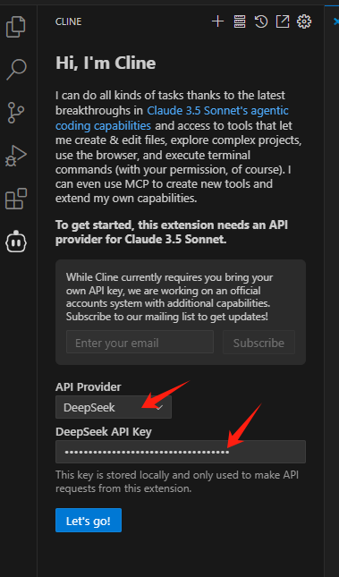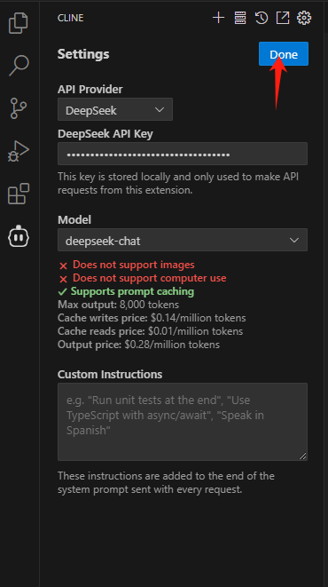 配置DeepSeek的API key: