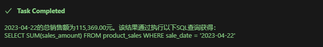 复制CREATE TABLE product_sales ( id int auto_increment PRIMARY KEY comment 主键, product_name varchar(255) comment 商品名, price DECIMAL(10,2) comment 商品单价, quantity int comment 销售量, sale_date date comment 销售日期, key idx_product_name(product_name) ); INSERT INTO product_sales (product_name, price, quantity, sale_date) VALUES (iPhone 12, 8999, 10, 2023-04-21), (iPad Pro, 7999, 5, 2023-04-21), (MacBook Pro, 14999, 3, 2023-04-22), (AirPods Pro, 2199, 20, 2023-04-22), (Apple Watch Series 7, 3299, 8, 2023-04-22), (iPhone 11, 5999, 15, 2023-04-23), (iPad Air, 4699, 7, 2023-04-23), (MacBook Air, 9999, 4, 2023-04-24), (AirPods 2, 1299, 25, 2023-04-24), (Apple Watch SE, 2599, 12, 2023-04-25);1.2.3.4.5.6.7.8.9.10.11.12.13.14.15.16.17.18.19.20.再到Cline询问: