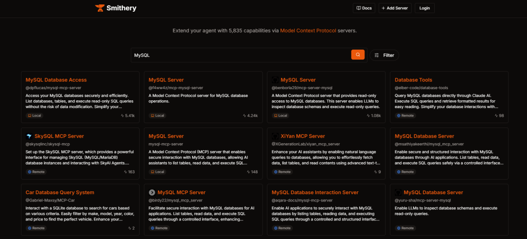 5.更多MySQL相关的MCP工具可以去MCP工具合集里搜索MySQL关键字,工具集地址:https://smithery.ai