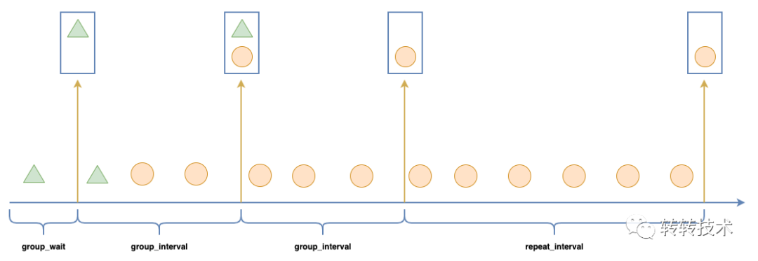 初始等待时间(group_wait):一组告警第一次发送之前等待的时间,站群服务器用于等待同一组的更多告警合并发送。变化等待时间(group_interval):一组已发送初始通知的告警在接收到新告警或有告警恢复后,再次发送通知前等待的时间。重复等待时间(repeat_interval):一组已发送初始通知的告警,组内告警均没有恢复且没有新增告警,再次发送通知前等待的时间。下面以一张图,来展示从告警产生到合并到某个集合中,到发送通知的整个过程。三角形和圆形表示不断产生的告警,矩形代表实际的通知时间以及告警内容。