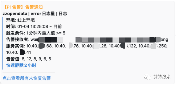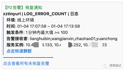 .phone("188xxxxxxxx", "180xxxxxxxx")..1.2.3.4.5.6.7.8.9.10.11.12.13.14.15.为了防止告警过多时淹没了重要告警,在每条告警的最后,都提供了一个未恢复告警链接,用于实时查询当前未恢复的告警。