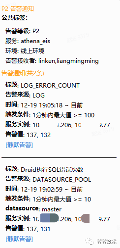 如下,为4条告警合并到一条通知,可清晰的看到两台机器的异常日志报警的原因是由于Druid执行SQL错误导致。