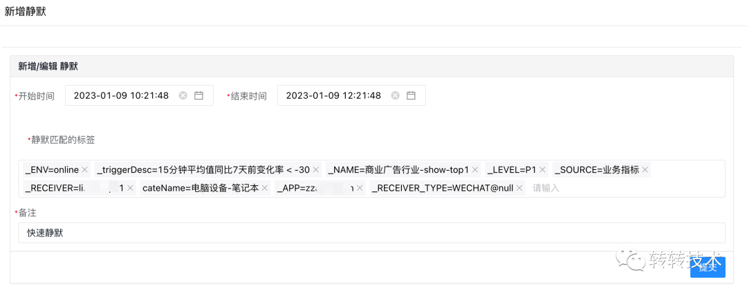 点击新增静默后,会自动补充静默匹配的标签项,也可以增减标签项,如:去掉INSTANCE标签维度以便匹配所有的机器,修改_RECEIVER为其他人等。需要注意的是,添加静默时RECEIVER必须要指定。