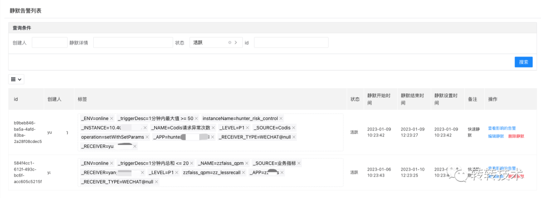 在静默列表内可查询所有的活跃、过期的静默项,可编辑、删除、查看影响的告警。