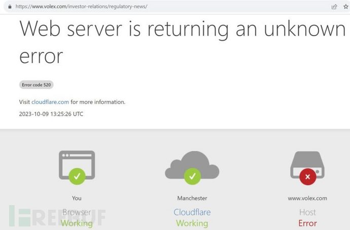 然而,在UTC时间13:25:26 检查时,Volex网站已离线,显示Cloudflare页面。尽管如此,在撰写本文时,该网站已恢复并可供访问者使用。