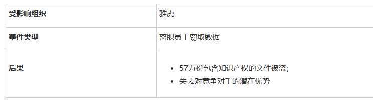 2022年5月,雅虎高级研究科学家窃取了雅虎AdLearn产品的机密信息。泄露的数据包括570,000份文件,其中包含源代码、后端架构信息、秘密算法和其他知识产权。在收到雅虎竞争对手的工作邀请几分钟后,该恶意员工将这些数据下载到他的个人存储设备中。在发现这一事件后,雅虎对该员工提出了三项指控,包括窃取知识产权数据,声称他的行为暴露了公司的商业秘密,给竞争对手带来了巨大的优势。