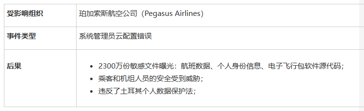 2022年3月,一群网络安全爱好者通知珀加索斯航空公司(Pegasus Airlines),他们6.5TB的敏感数据被暴露在网上。发生这种情况是因为系统管理员未能正确配置存储这些记录的云环境。该漏洞可能会影响数千名乘客和机组人员。由于泄露员工的个人信息,该航空公司违反了土耳其个人数据保护法(LPPD),这可能导致最高约18.3万美元的罚款。