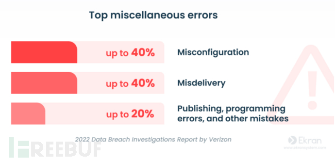 根据Verizon 《2022年数据泄露调查报告》指出,内部行为者无意中犯下了各种错误。犯下此类错误的高层内部人员通常是特权用户(系统管理员和开发人员)和其他终端用户。他们最常犯的错误是: