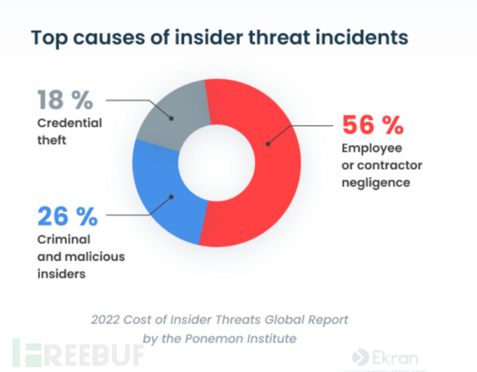 雇员或承包商疏忽,占比56%;有犯罪意图和恶意的内部人士,占比26%;凭据盗窃,占比18%;