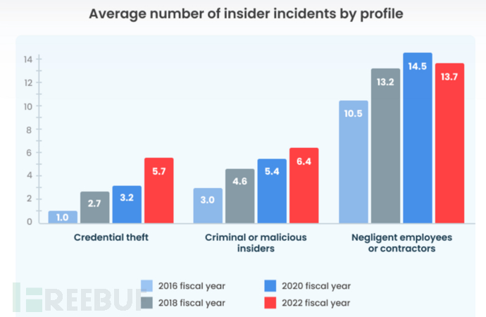 波耐蒙研究所(Ponemon Institute)发布的《2022年全球内部威胁成本报告》也证实,由凭据窃取、恶意内部人士和雇员或承包商疏忽3个因素造成的内部威胁正变得越来越频繁,具体如下图所示。
