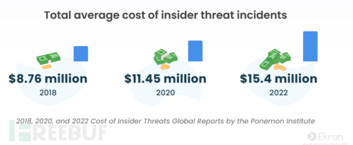 波耐蒙研究所对内部威胁的成本进行了三次研究:2018年、2020年和2022年。根据这些研究,2018年至2022年间,内部威胁的总平均成本增加了76%,从2018年的876万美元飙升至2022年的1540万美元。