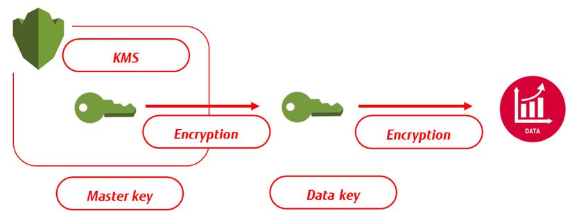AWS 中的存储解决方案是 S3。如果客户在 S3 中使用服务器端加密,AWS 会提供 S3 托管密钥 (SSE-S3)。这些是使用主密钥加密的唯一数据加密密钥( DEK ),即密钥加密密钥( KEK )。主密钥不断地重新生成。对于加密,AWS 使用 AES-256。