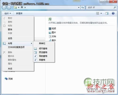 若Windows 7资源管理器界面布局过多,也可以通过设置变回简单界面。操作时,点击页面中组织按钮旁的向下的箭头,在显示的目录中,选择“布局”中需要的窗体,例如细节窗体、预览窗格、导航窗格等。二、文件夹查看管理更快捷
