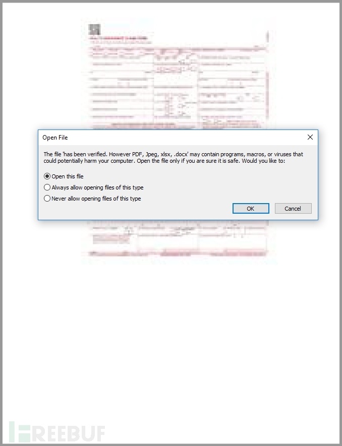 当用户打开PDF文件时,Adobe Reader会提示用户打开其中包含的DOCX文件。显然,这样的操作很不寻常,让人感到迷之疑惑。因此攻击者巧妙地将嵌入的Word文档命名为“已验证”,那么弹出的“打开文件”提示声明就会变成文件是“已验证的”。